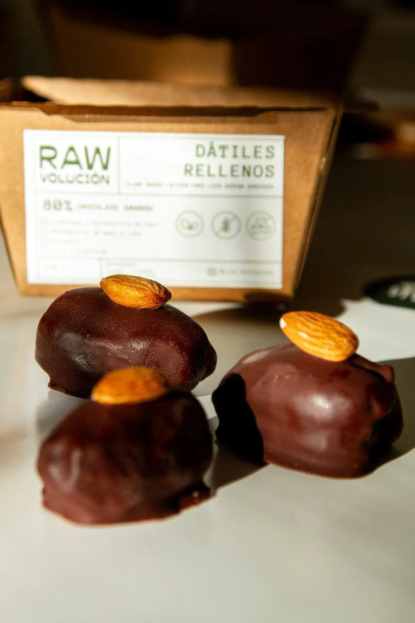 3 dátiles mejoul rellenos de crema de coco y almendra bañados en chocolate amargo al 80%