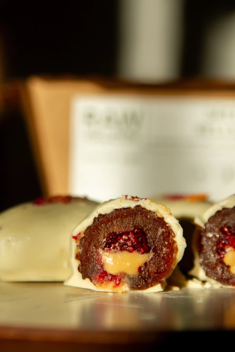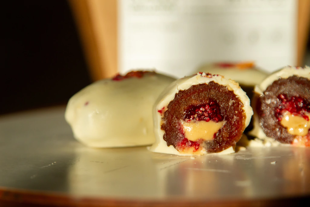 3 Datiles Medjoul rellenos de frambuesa y mantequilla de maní bañados en chocolate blanco vegano y sin azúcar